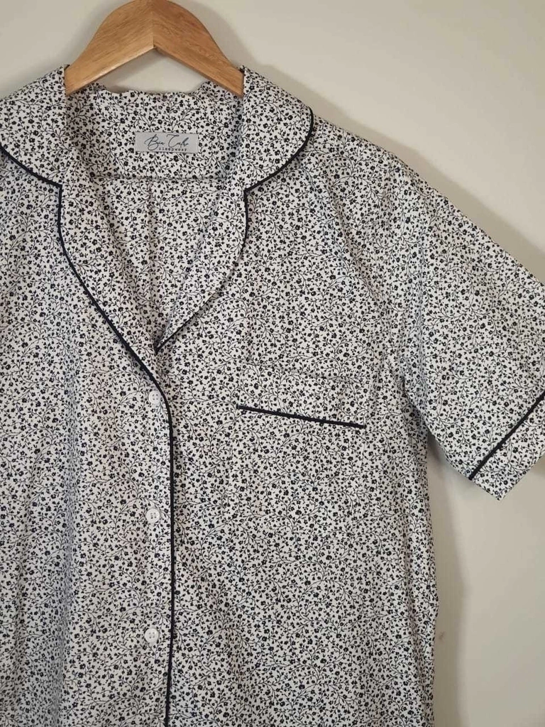 O conjunto de calça e camisa manga curta (100% algodão) possibilita seu uso durante todo o ano, aliando elegância e estilo ao conforto do algodão. A estampa floral delicada ganha força com a cor do azul marinho!